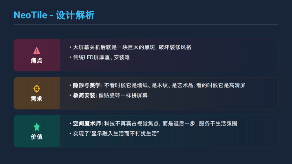 NeoTile以“让科技退居生活之后”的设计策略,消解了屏幕与空间的割裂:10mm超薄体态、拟真纹理的“隐显自如”,让显示设备从冰冷工具变为生活场景的自然延伸,精准接住“不被科技打扰”的日常期待。它锚定显示装饰新赛道,推动大屏从商业领域下沉至生活空间,既以低碳材质践行绿色理念,更以“服务而非侵占”的设计重构科技与人文的关系,是数字时代“功能让位于体验”的美学注脚。