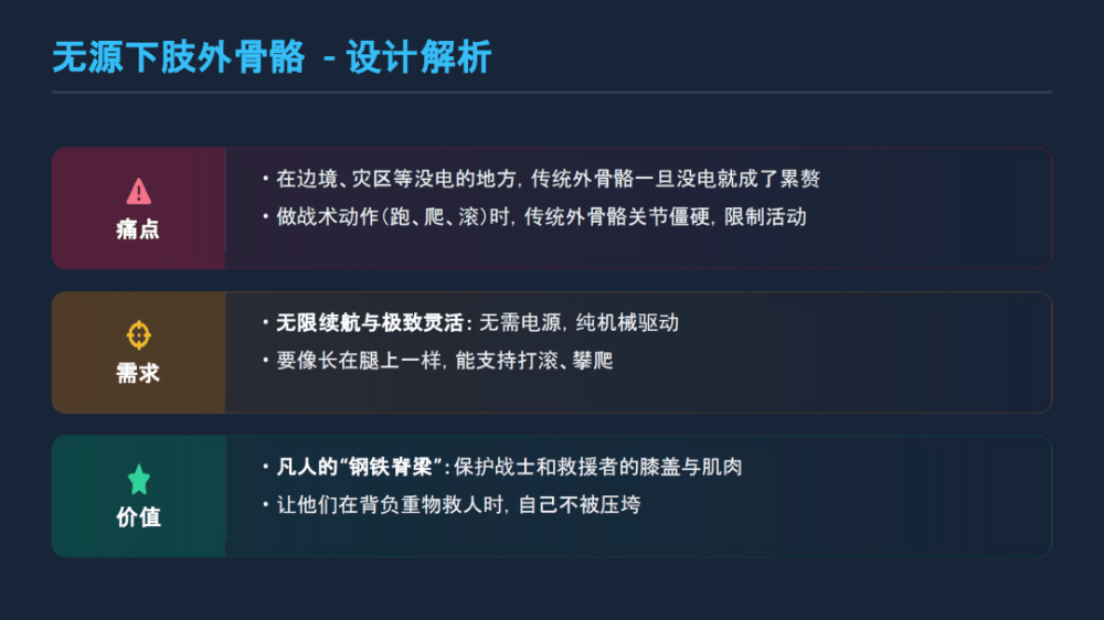提案内核:在电力与算法之外,存在一种更质朴、更可靠的智慧——纯机械的仿生结构,足以在极端环境下成为人体的“钢铁脊梁”。