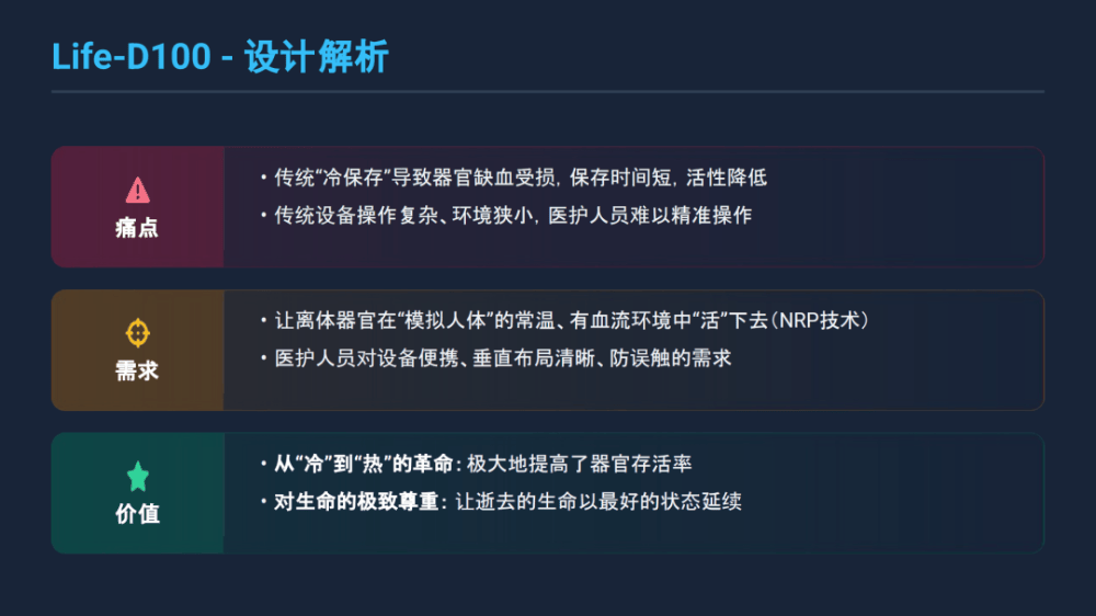 《设计》洞察:Life-D100供体灌注机的设计核心,是对生命尊严的技术诠释。模块化布局的设计,精准适配手术室的空间限制与应急操作需求,通过流程优化降低手术风险;而NRP技术的场景化设计,模拟人体环境让器官“热延续”,并非单纯的技术突破,而是将“生命延续”的人文命题转化为可落地的设计方案。设计作为人道与技术的纽带,填补了国内空白,让从“冷保存”走向“热延续”,其“安全冗余+生命适配+人文关怀”的设计逻辑,为医疗器械行业树立了“技术精度服务于生命温度”的伦理标杆,让医疗设备从“工具”升级为“生命支持系统”,彰显了设计在医疗健康领域的人文担当。