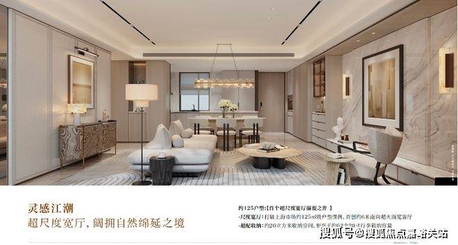 约125㎡户型,首创约6米南向超大面宽客厅,边户可拓展至近9米面宽,配独立岛台,超配约20m³收纳系统。